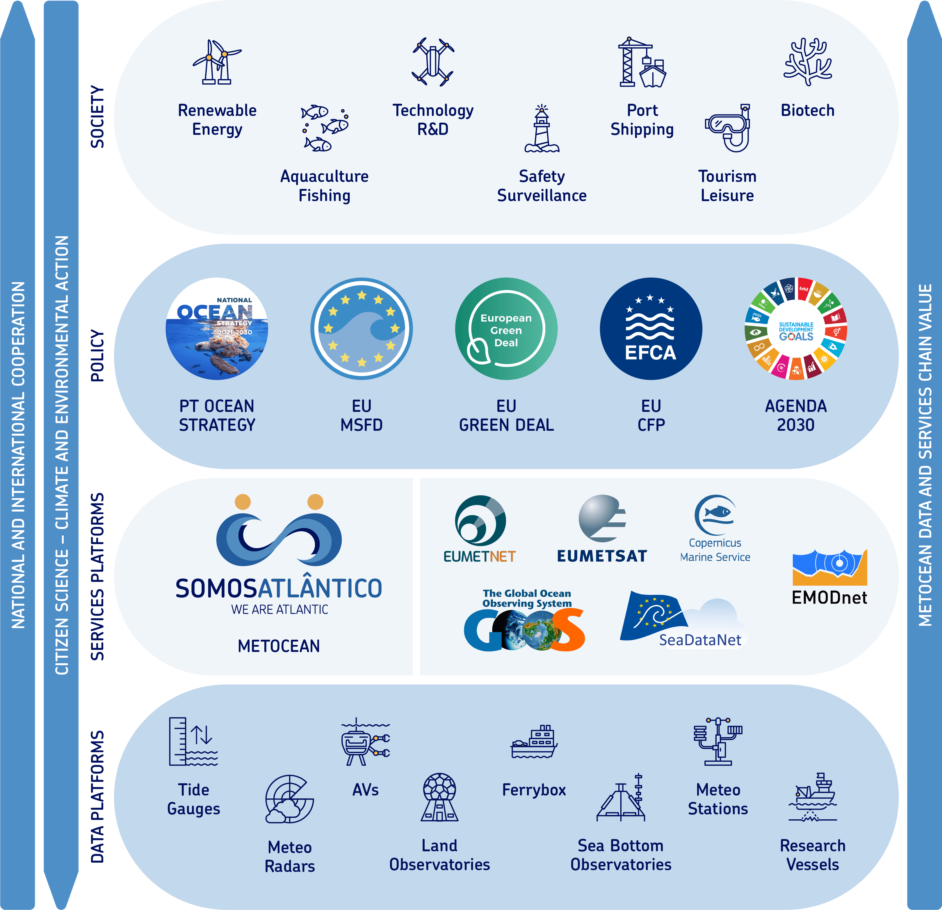WEAREATLANTIC is the result of the execution of the "Atlantic Observatory - Data and Monitoring Infrastructure" Project, funded by EEA Grants, whose objectives aim to enhance ocean research and monitoring, addressing the needs and gaps in science, technology, and society. The platform is a fundamental element in the value chain of ocean observation, promoting the principle of "measure once, use multiple times," serving as a bridge between observatories and end-users, enhancing data and its integration at various levels of society, from research and development to education and literacy, the blue economy sectors, and public administration.